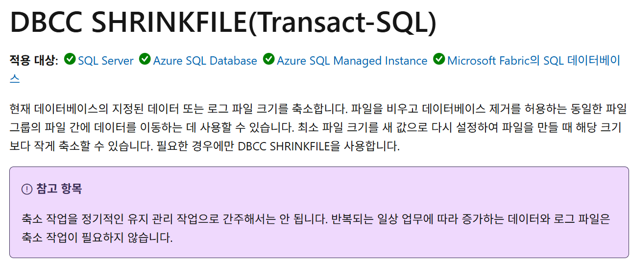 기존에 응급대처로 SHRINKFILE 을 사용해서 로그를 축소시킨 경험이 있습니다. 하지만 추후 알아보니, 이는 해결 방법이 아니었습니다. (:뭐, 필요할 때가 있겠지만, 주기적인 관리 포인트가 아닌것은 공식문서로 확인했음.)
